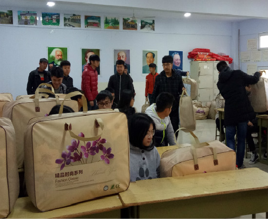 多年来,学校十分关注家庭经济困难学生过冬问题。每年都会在寒冬来临之际向贫困学生发放棉被,以减轻学生的生活顾虑,在校安心学习生活。让同学们对未来的大学生活充满希望和信心。