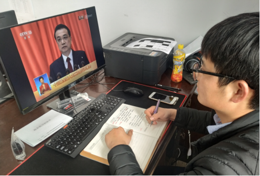 2019年3月5日上午,十三届全国人大二次会议在北京人民大会堂隆重召开。机电工程学院组织师生收看会议实况直播,认真聆听李克强总理的报告,学习会议精神。在日益楼201教室,他们正聚精会神听着报告、全神贯注做着笔记,每当听到报告精彩之处自发为之鼓掌,气氛庄严而又热烈。