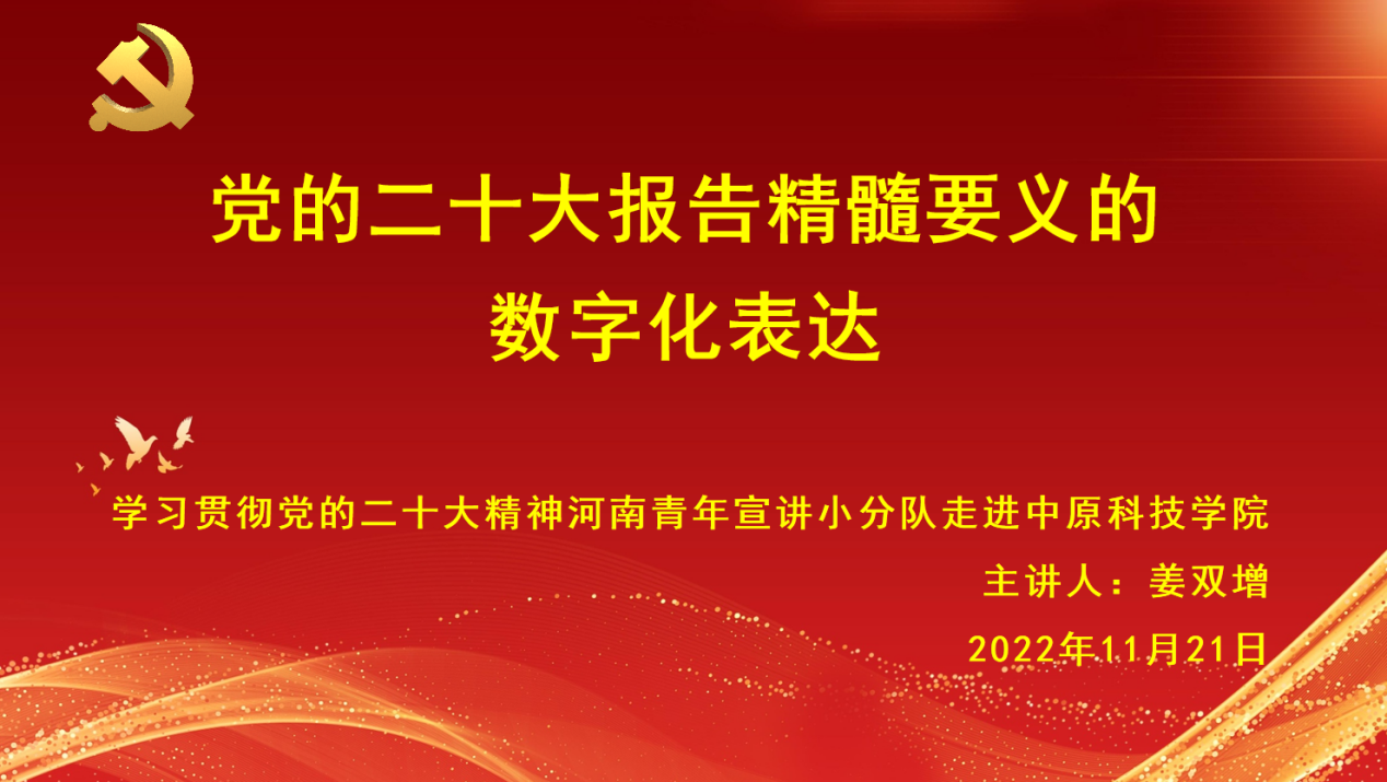 为深入学习贯彻党的二十大精神,并作为当前和今后一个时期的首要政治任务,切实肩负起做好新时代党的青年工作的光荣职责,在共青团河南省委的指导和帮助下,我校成立了贯彻党的二十大精神河南青年宣讲小分队。11月21日,宣讲小分队成员机电工程学院团总支书记姜双增为学院全体学生干部作了主题为“党的二十大报告精髓要义的数字化表达”的报告。
