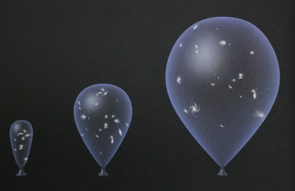 气球的表面被视为一个二维的有限宇宙。当气球充气时,它开始膨胀。气球上不同的点彼此退行。每个点都把自己当作膨胀的中心,中心存在于三维或”其他“维度。因此我们可以假想,一个橡皮气球的表面嵌有恒星和星系,气球在不断充气。所以,除去单个天体的运动和它们之间的正常引力作用,所有天体都在相互远离,这仅仅是因为气球在膨胀。