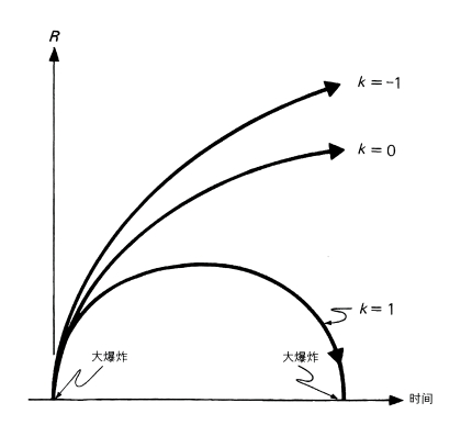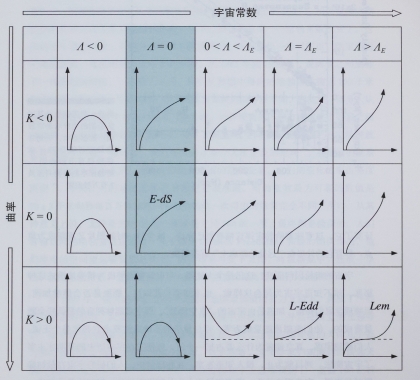 1922年,弗里德曼基于两点被简化的假设——各向同性和同质性,成功解出了爱因斯坦建立的繁琐的方程式,弗里德曼的宇宙是一系列数学模型,这种简单的方法帮助我们整合了所有关于宇宙膨胀的天文观测结果。人们在描述三种各相同性的膨胀宇宙模型时,总会用这张与众不同的进化图来表示,此图说明了宇宙大小与时间的关系。