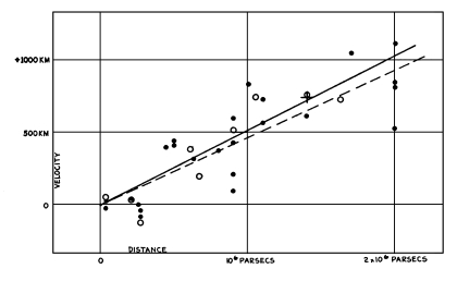这幅图像是1929年原版的哈勃定律图。该图显示了远方光源的速率(以千米/秒为单位)与其远离我们的距离(以秒差距为单位)之间的关系。