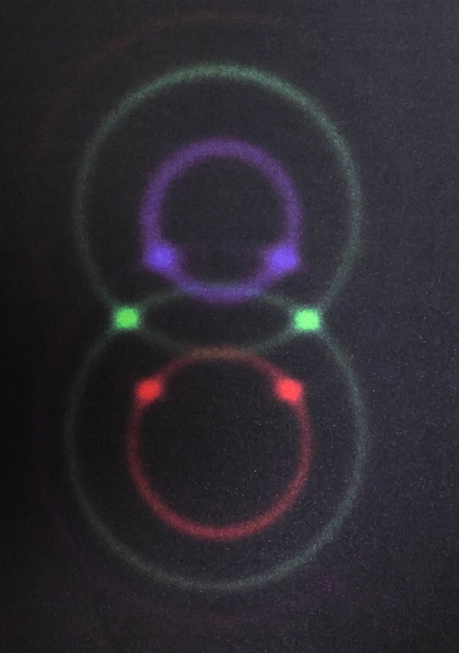 1995年,保罗·奎亚特和迈克尔·雷克让量子纠缠变得可见。我们可以看到穿过晶体的光形成了环。图中的两个绿环是由两个不同极化的光子形成的。两个绿环彼此切断,纠缠对中一个光子的极化与其在另一个切断处的值恰好相反,这就是量子纠缠的状态。