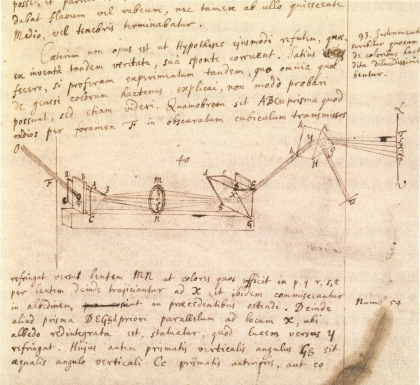 牛顿的笔记片段,记录了他利用棱镜将白光分解为不同颜色的光的实验研究,图中展现了多个棱镜造成的效果。牛顿的棱镜实验指引了人们理解光的折射、设计反射式望远镜、揭晓彩虹的形成之谜。1704年,牛顿对光学和光的研究被收入到他的第二本伟大著作——《光学》(Opticks)。