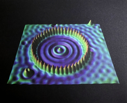 该图像中研究人员操纵铁原子形成圆圈形围栏,围栏内部呈现出电子波的干涉图样,中心形似“火炬”的亮点尤为引人注目,“量子围栏”是以纳米为单位计算的大小,正是其微小的组织结构使得量子“蜃景”现象成为可能。