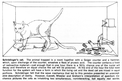 该图由布莱斯·德维特和尼尔·格雷厄姆绘制,图中展示一只猫被关在装有镭和氰化物的密闭容器里,镭的衰变存在几率,导致猫在未被观测时理论上处于既死又活的叠加态。这一实验深刻揭示了量子力学中的观测问题和叠加态原理,引发了广泛讨论。