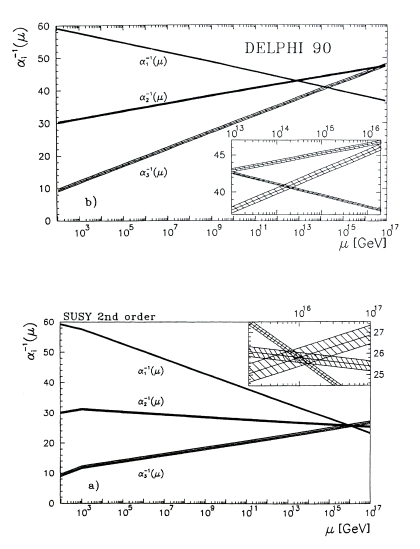 电磁力、弱力与强力的强度变化计算结果与大统一理论中能量增加的对比图