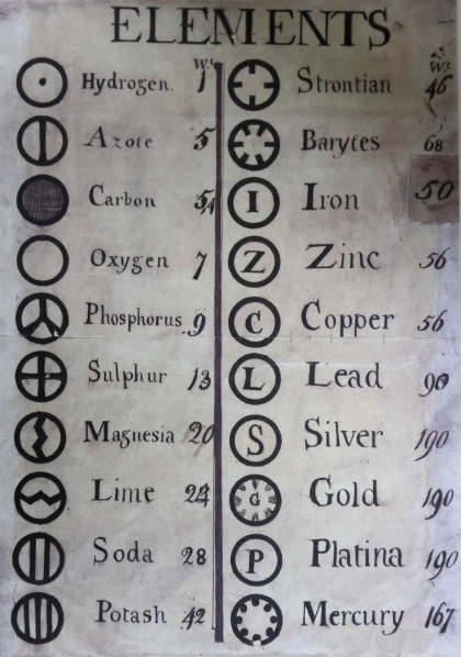 1805年,约翰·道尔顿以拉瓦锡的研究为基础,解释了元素之间的结合方式以及基本成分对化合物重量的影响,并通过图画的形式对20种基本组成元素进行了展示。