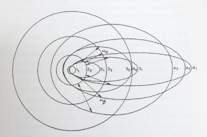 氢的电子轨道和量子能量级。波尔在1922年获诺贝尔物理学奖的演说中使用的图。