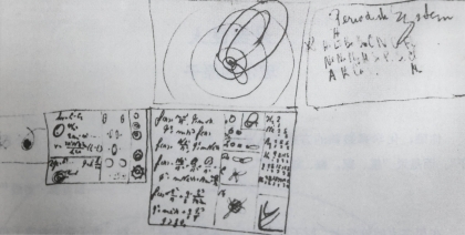 玻尔在1921年的笔记,描述了原子中围绕原子核旋转的电子的量子化轨道。
