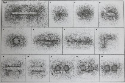 法拉第在《电学》(1852年)中展示的磁石周围的铁屑分布图