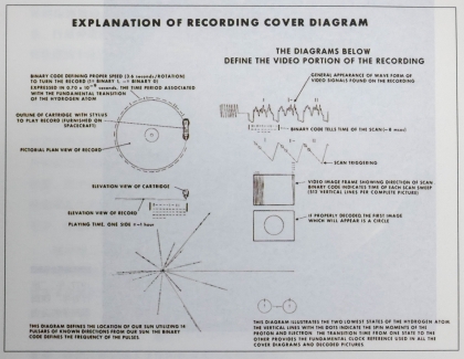 此图解释了旅行者1号和2号携带的金色光碟上的图像和符号。光碟的设计目的是向未来的外星生命表示人类的友好,光碟录制了有关地球和人类的声音及视觉图像。旅行者号在1977年发射,它将于40 000年之后抵达离我们最近的恒星。
