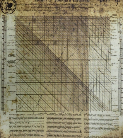 “拉兰尼算盘”或“通用计算器”,于1843年9月11日由法兰西科学院通过。使用者可以通过其中的斜线计算各种几何量,如球体积、表面积、几何形状的周长,以及不同重量和长度单位系统间的转换。