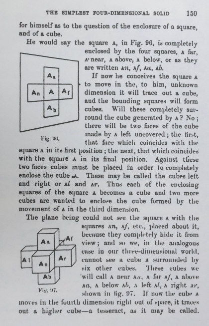正如把一个空立方体沿边缘剪开,然后把它展开放平,在二维的表面形成一个T字型一样,查尔斯·辛顿用三维展示了打开的四维立方体。图片摘自他的书《第四维》。