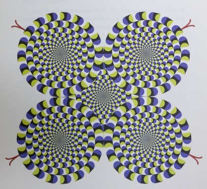 日本视觉艺术家北冈明佳通过发觉边缘移动错觉(蛇看起来好像在转)和螺旋错觉(灰色的同心圆好像在盘旋)创作了复杂的转动效果。从20世纪60年代的“欧普艺术运动”开始艺术家们发现了大脑与眼功能之间的含混之处,从而利用大脑持续搜索图案和线条的特性,造成一种视觉反馈,让大家感到图片里的图案似乎一直在动。