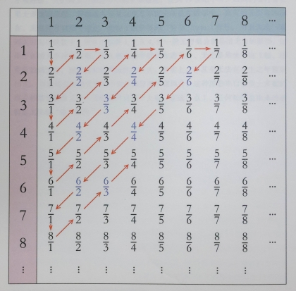康托尔通过一个个地计算有理分数的个数,以便保证无一遗漏,这也证明自然数集合与分数集合这两个无穷的大小相同。