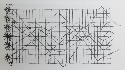 10世纪图表,是迄今所知的第一张图表,它展现了当时已知行星和太阳的位置随时间的变化,每条线代表不同的行星。它用于表示此后被称为太阳系行星的轨道倾斜差异和时间之间的关系。
