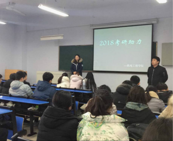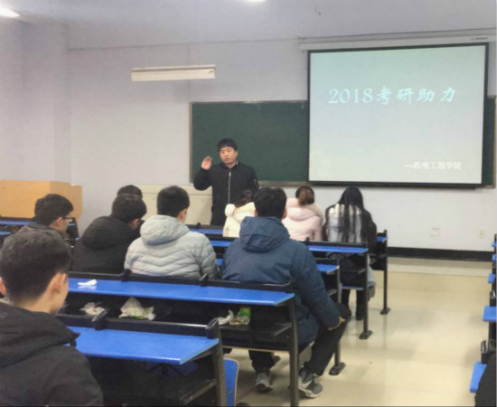 为鼓舞我院学子研考士气,做好考前准备。2017年12月18日,由机电工程学院主办,主题为“助力青春 圆梦研考”助力动员会于日益楼201召开,机电工程学院团委书记马鹏辉与孟繁欣老师出席讲话。