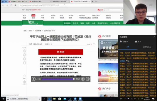 4月14日,机电工程学院各年级学生在辅导员组织下,通过中国大学生在线、国家开放大学网站等等有关在线教育平台,观看学习了教育部录制的“2020全民国家安全教育日高效公开课”。本次课程主题为“总体国家安全观视角下的疫情防控”,主讲人为公共安全领域专家、中国工程院院士范维澄。
