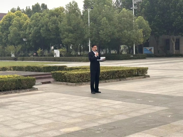 升旗仪式上,土木建筑学院党总支书记发言,呼吁广大学生要珍惜大学时光,立志高远,坚定信念,坚持听党话、永远跟党走,以只争朝夕精神去努力,真正做一个能担当民族复兴大任的时代新人。