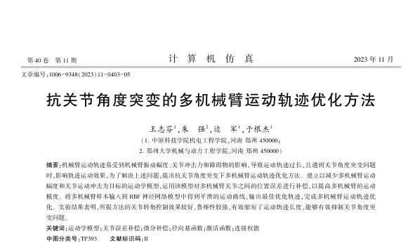 近日,中原科技学院机电工程学院王志芬老师以第一作者在机械类北大核心期刊《计算机仿真》发表题为《抗关节角度突变的多机械臂运动轨迹优化方法》的研究论文,该成果以中原科技学院为第一完成单位,为提升机械臂运动控制精度提供了创新解决方案。