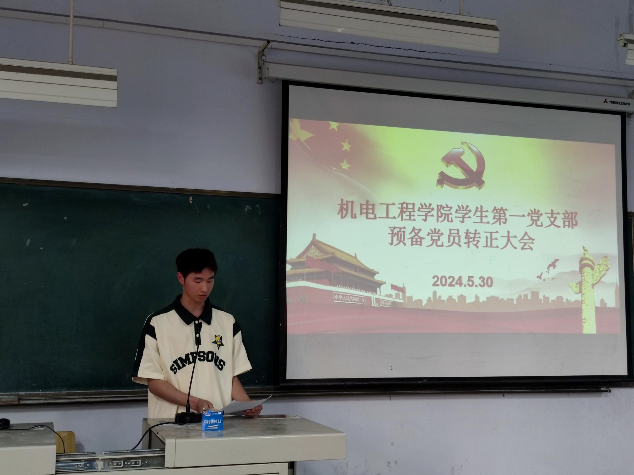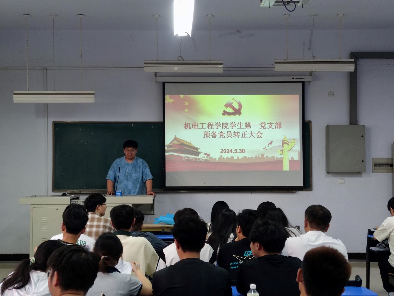 2024年5月30日,机电工程学院学生第一党支部在郑州校区日益楼202室召开支部大会。会议由学生第一党支部书记海龙飞主持,机电工程学院学生第一党支部全体党员参加。会议主要内容为:讨论并表决接收王红天等11名发展对象按期转为预备党员以及周寅权等13名预备党员按期转为正式党员的问题。
