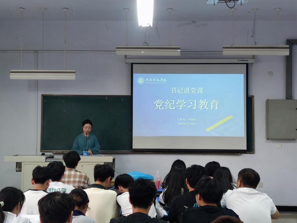 5 月 30 日,机电工程学院党总支书记李欣洁在日益楼201为学生第一、第二党支部全体党员讲授了一堂深刻而重要的党纪学习教育课。