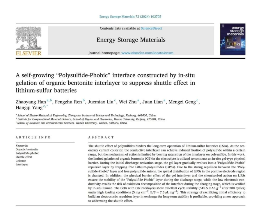 近日,国际著名期刊《Energy Storage Materials》发表以我校为第一完成单位,机电工程学院韩朝阳博士为第一作者的研究成果“A self-growing “Polysulfide-Phobic” interface constructed by in-situ gelation of organic bentonite interlayer to suppress shuttle effect in lithium-sulfur batteries”。《Energy Storage Materials》是材料科学类中科院一区top期刊,影响因子IF:18.9。