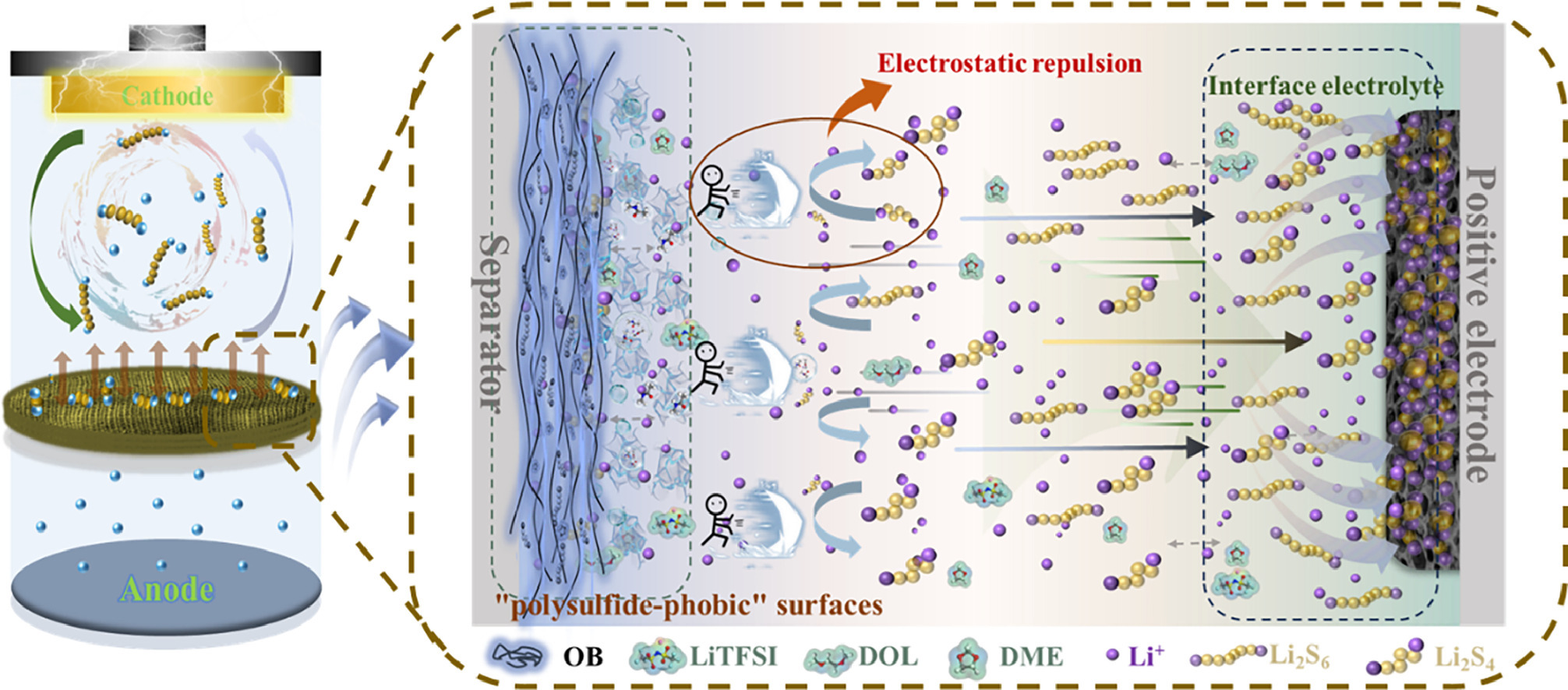 该研究利用工程材料中有机膨润土(OB)的有限凝胶作用构建了一个原位凝胶型物理屏障。在最初的放电活化阶段,凝胶层通过捕获游离锂-多硫化物(LiPSs)逐渐演变为“多硫化物-排斥”层。由于“多硫化物-排斥”层与游离多硫化物阴离子之间的强排斥力,正极区域锂多硫化物的空间分布发生了变化。此外,凝胶夹层对锂多硫化物的物理屏障效应和化学吸附作用保证了“多硫化物-排斥”层在放电阶段的稳定性,而低电导率避免了界面氧化分解的风险,并通过原位拉曼进行了验证。在高负载条件下(5 mg cm−2,E/S ≈ 7.5 μL mg−1),OB夹层具有良好的循环稳定性(300次循环后为515.5 mAh g−1)。这种牺牲初始效率来建立静电排斥层以换取长期稳定性的策略是有益的,这为解决穿梭效应提供了一种新的方法。