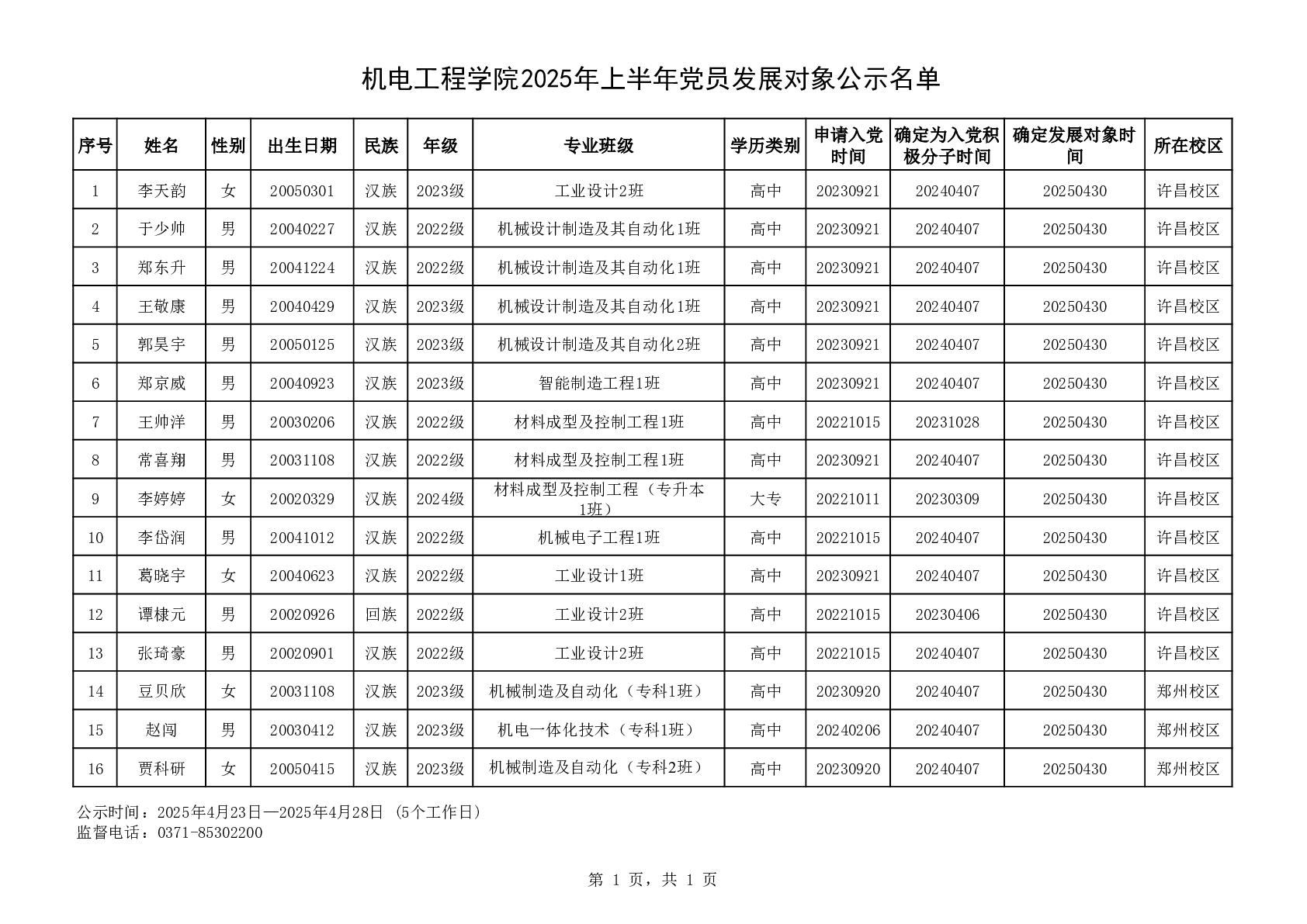机电工程学院2025年上半年党员发展对象公示名单