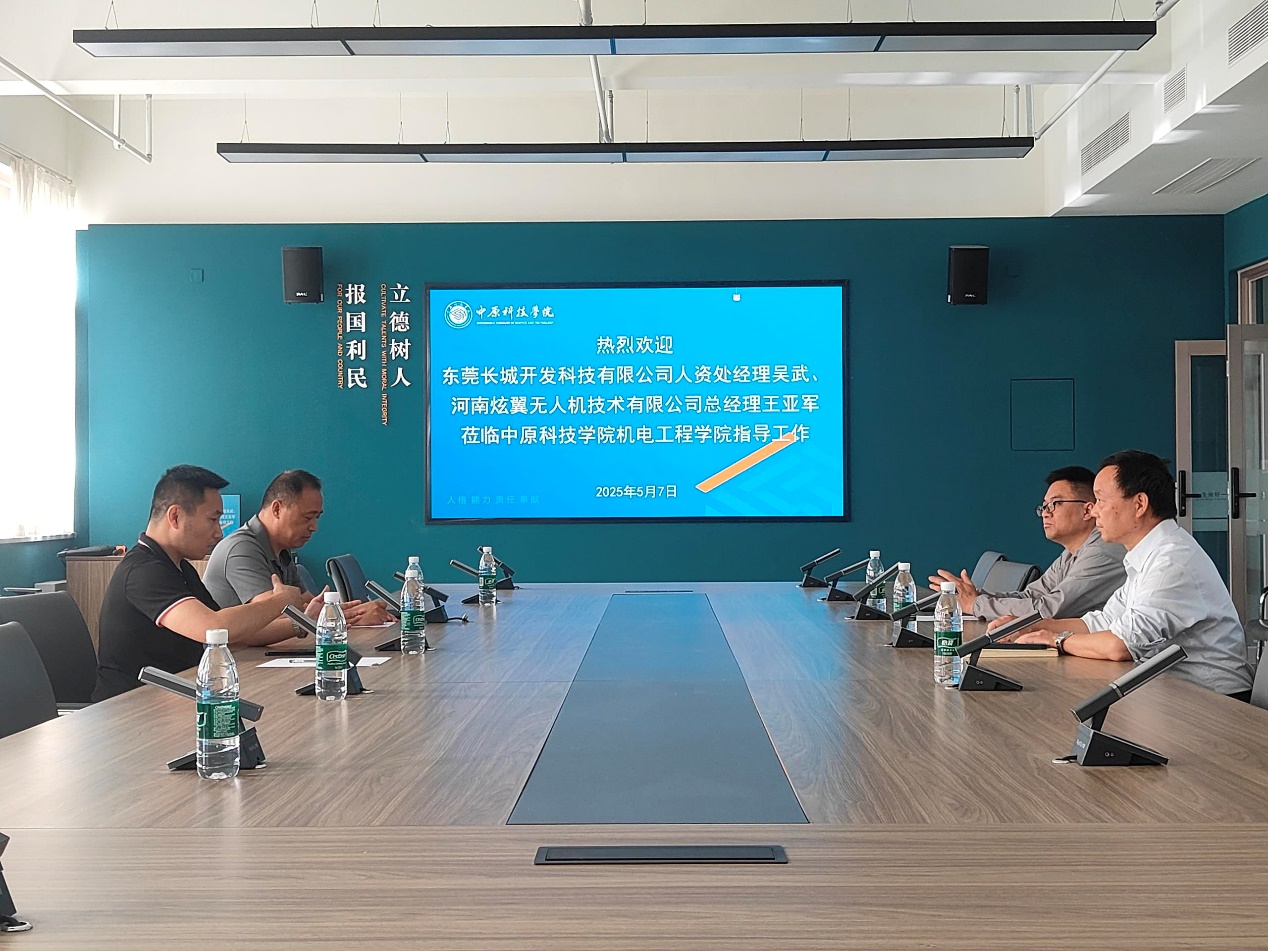 2025年5月7日下午,东莞长城开发科技有限公司人资处经理吴武、河南炫翼无人机技术有限公司总经理王亚军到访中原科技学院机电工程学院,开展考察交流活动。此次活动由机电工程学院院长苏建修教授主持,学院副书记王贺振一同参与。